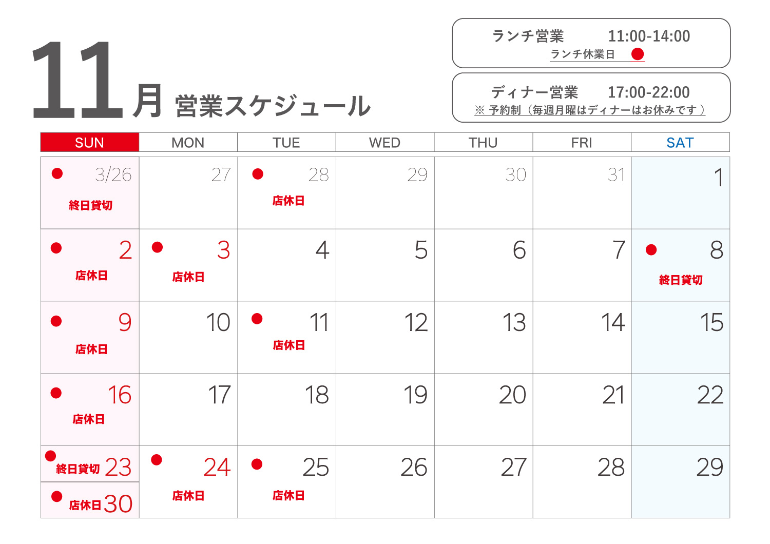 ※その他、貸切・ランチ休業日等ございますので下記ご確認下さいませ。
